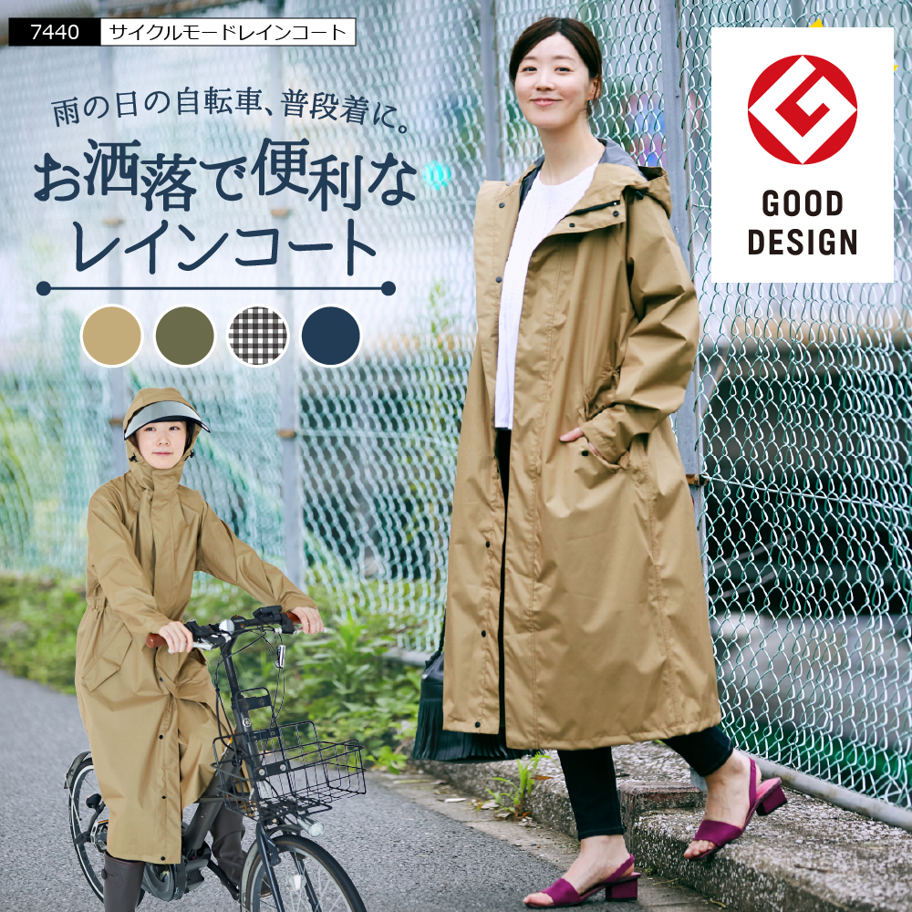 | 日常での使いやすさを重視し、街歩きや自転車運転で便利な機能が満載の快適・スタイリッシュなレインコートです。防水性と軽さ、素材感にこだわったTPUラミネート加工によって着心地は抜群。TPU(熱可塑性ポリウレタン樹脂)は従来のポリウレタン樹脂より劣化が起きにくい素材なので耐久性に優れています。軽い素材で雨の日でもストレスなく過ごすことができます。レディースのパターンを採用しているので、キレイめのファッションにもマッチ。女性デザイナーがこだわって作った商品です。さらにウエスト周りをドローコードで絞れば洗練されたシルエットが可能です(内側から絞れます)。前裾には雨を防ぎバタつきを抑えるアンダーガード(三角マチ)を配置。自転車運転で気になるペダルをこいだ時に膝・脚が濡れる心配を軽減しました。フード内側にはレインバイザーをスナップボタンで取り付けできるバイザーシステムを搭載しています。レインバイザー(別売り)と合わせて使えば、クリアな視界を確保でき女性が気になるメイク崩れも防止できます。フードは被りの深さを調整できるマジックテープと顔周りのドローコードがついているのでフィットさせることが可能です。雨が吹き込みにくいよう高めの襟元や、袖口も大型のタブで絞ることができ、おしゃれさだけでなく濡れにくいようフィット感にもこだわっています。膝下丈のロングコートでレインブーツと合わせれば足元もしっかりガード。普通のコートに近いシルエットと、普段使いしやすいベージュ・ギンガム・オリーブ・ネイビーのカラー展開でトレンチコートやスプリングコート感覚で、雨が降りそうなときや止んだ後に着ていても違和感がありませんよ。軽くて場所を取らないので旅行や職場に置いておくのもオススメ。薄暗い雨に日には重要なリフレクター(反射材)も、フードを被らないときは隠れる位置に配置してあるので、いかにもカッパという感じが無く羽織りやすいです。鍵などを入れるのに便利な左右のポケットと、収納袋の付属などあったら便利のポイントもしっかり押さえています。雨の日の自転車で、機能もおしゃれも妥協したくない人のための、高い機能性とデザイン性を両立させたレインコートです。 |