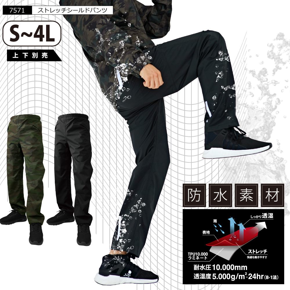 商品説明 | 大雨でも安心の耐水圧10,000mmとムレを逃す5,000gの透湿性を備えた軽量レインパンツです。ヒップ部分はシームレス。自転車やバイクでご使用の際に浸水が心配なお尻部分の縫い目を無くしました。重さは約200gと軽量で、コンパクトに折り畳んで持ち運べます。いつものバッグに入れて置けば突然の雨にも安心。お手持ちのレインコートやレインポンチョにプラスで着用頂くと防水性が高まります。左右に小物収納に便利なポケットを設置。背面両裾に後方からの視認性を確保する反射リフレクターを配置しました。S〜4Lサイズの豊富なサイズ展開で、男女問わずご使用頂けます。ストレッチ性を備えた生地を立体裁断しているので動きやすく、毎日の通勤や通学はもちろん、登山やアウトドア、ワーク用のレインウェアにもおすすめです。同じ素材を使用した別売りの「7570ストレッチシールドジャケット」とあわせてセットアップで着用頂けます。キャンプやウォーキング、作業用の雨具として、自転車通勤や登校時などデイリーユースにも幅広く活躍してくれます。 |