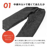 | 中わたを使用した寒い冬に大活躍のキルトパンツです。ポケット無しでスッキリとしたデザインです。作業やウォーキングの際のオーバーパンツとしてオススメ。別売りのキルトヤッケ、セミキルトヤッケと合わせればセットアップでも着用が可能です。 |