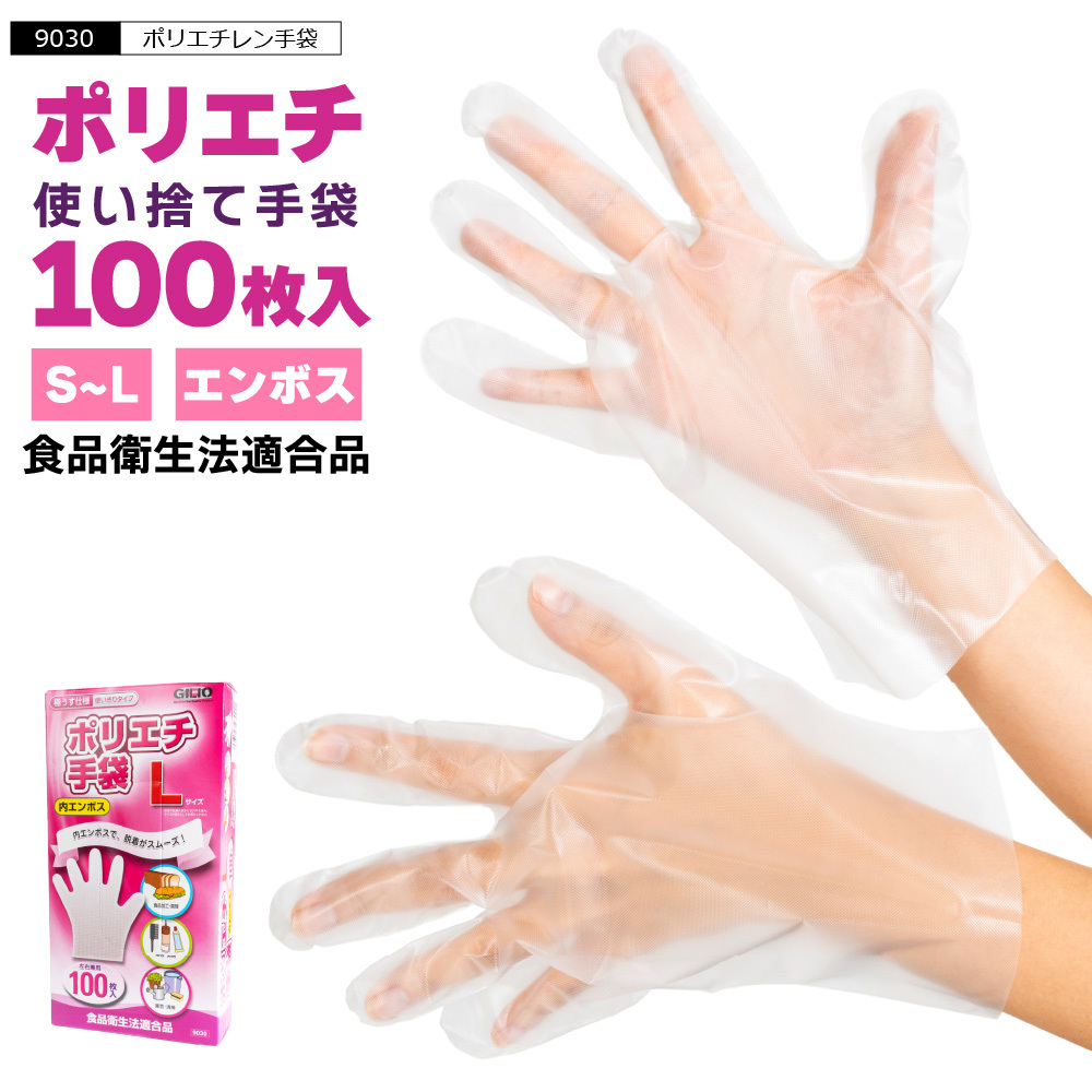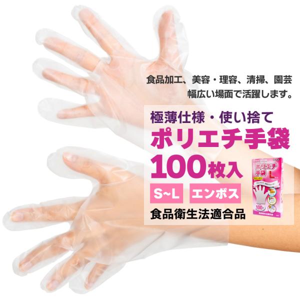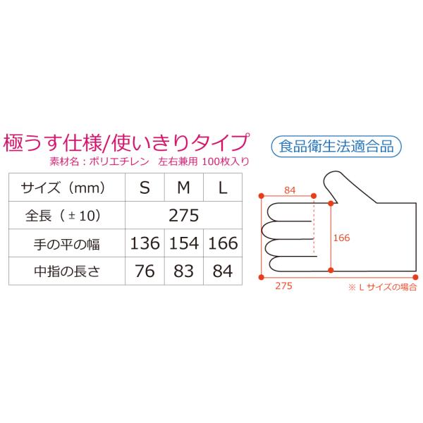 | 極薄の使い捨てタイプのポリエチレン手袋です。 お得な100枚入り。 |