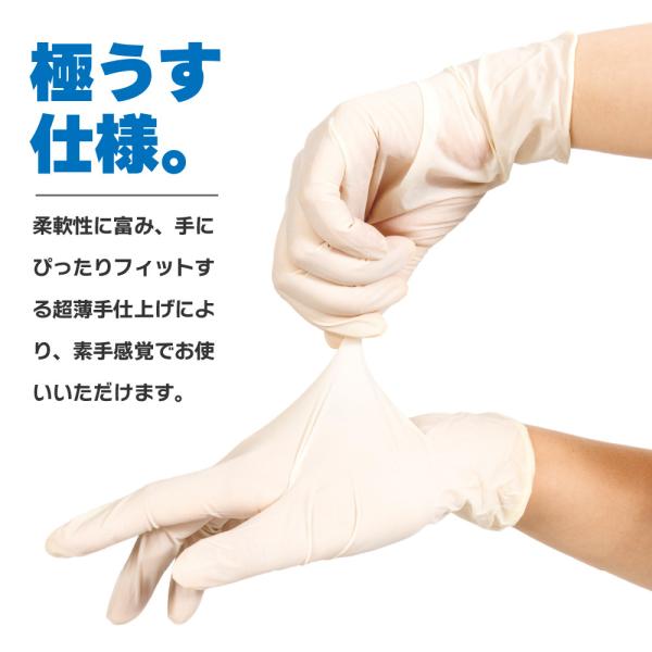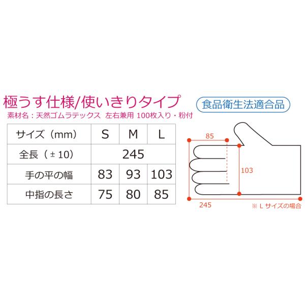 | 極薄の使い捨てタイプの天然ゴム手袋です。 お得な100枚入り。 |