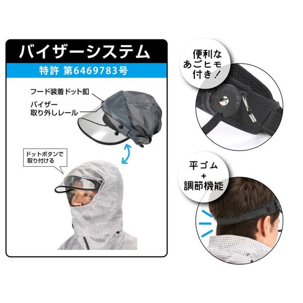 | 商品説明 | V-001レインバイザーがより便利になってリニューアル。後ろ部分が平ゴムのバンドになって、フィット感が倍増!バイザーシステム搭載のレインウェアに取り付けることができます。ドットボタンで取り付けるので、簡単に装着可能です。この際、先にフードに取り付けておくと着用がスムーズです。クリアカラーですが、UVカット率90%を誇り、晴れの日の紫外線防止にも最適です。 |