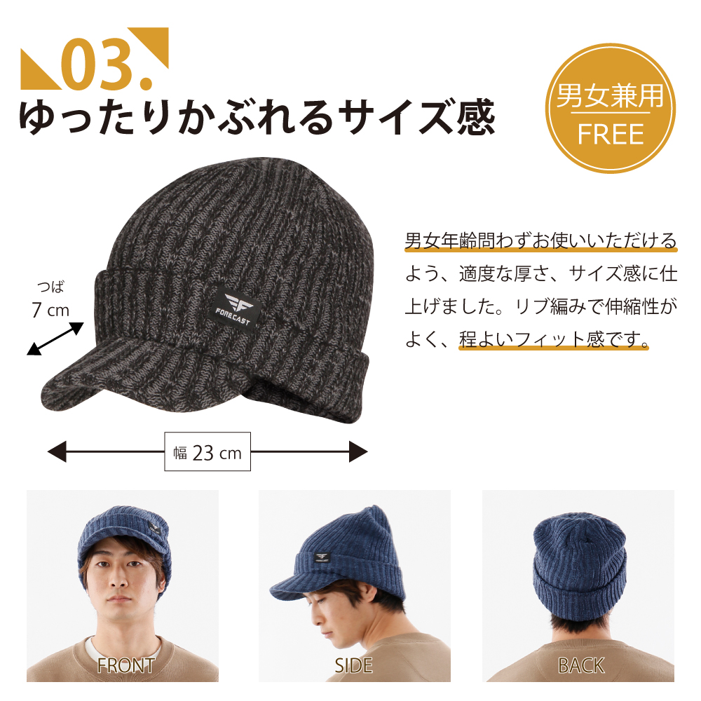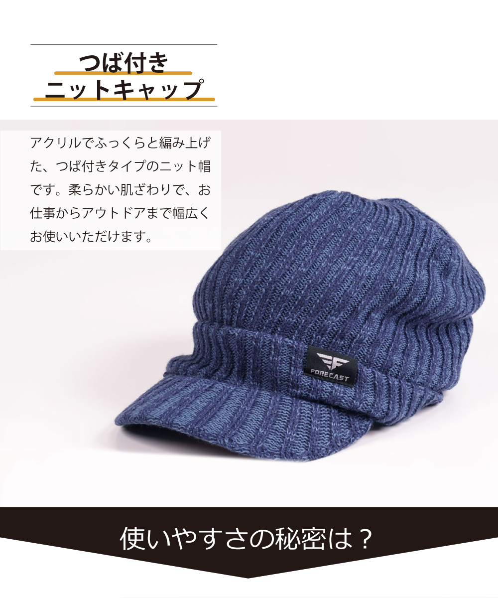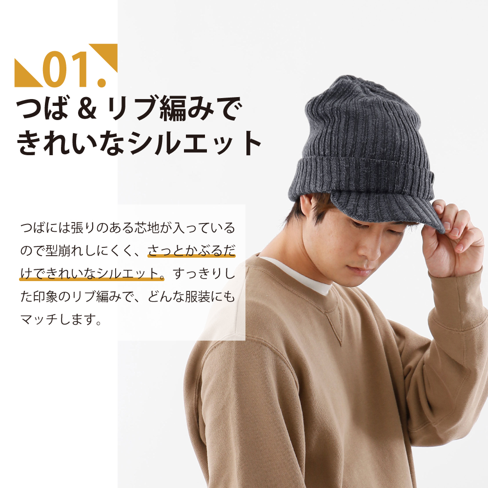 秋冬に活躍するつば付きのニットワークキャップです。素材はアクリル100%で手洗いが可能。防寒性にも優れています。ご自身でお好みの深さでかぶっていただけます。定番のデザインで年齢やオンオフ問わず幅広くお使いいただけるアイテムです。