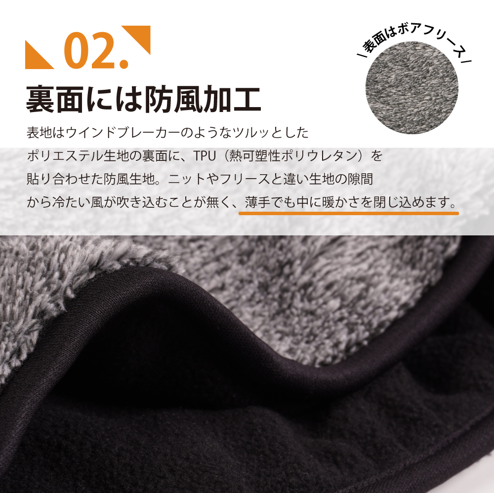 | 商品説明 | 毛足が長めのボアフリースで防風タイプのネックウォーマーです。ボリュームがある毛足でふわふわ肌触りがよく、引き上げれば口元まで覆うことができます。中面に防風加工をすることで、冷たい風の中での自転車やスポーツ、屋外での作業などでも首回りの暖かさをキープ。無地なのでアウトドアなどのレジャーからお仕事まで男女問わずおしゃれにお使いいただけます。 |