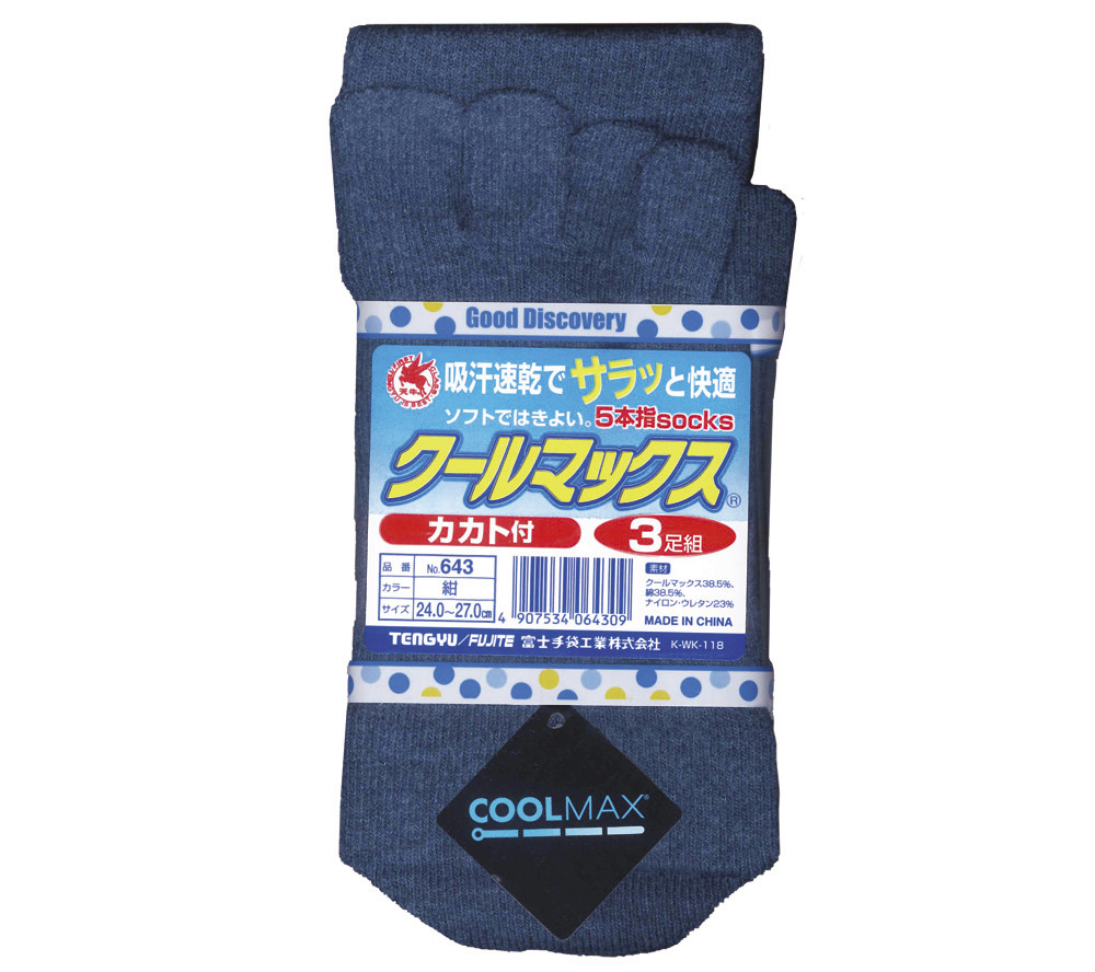 ●在庫限り●富士手袋工業 No.643 五本指靴下 クールマックス カカト付き 3足組 紺