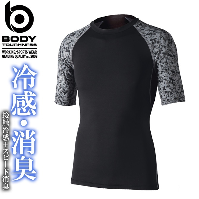 BODY-TOUGHNESSシリーズ☆ひんやり涼しい夏用のコンプレッションウェア!機能も満載で接触冷感はもちろん、UVカット、スピード消臭、吸汗速乾などの機能付き!首元は丸首クルーネックデザインです。生地は肌に密着するので適度な圧力が身体をサポートします◎またサイドの脇下部分がメッシュタイプになりますので、さらに涼しさ抜群です!