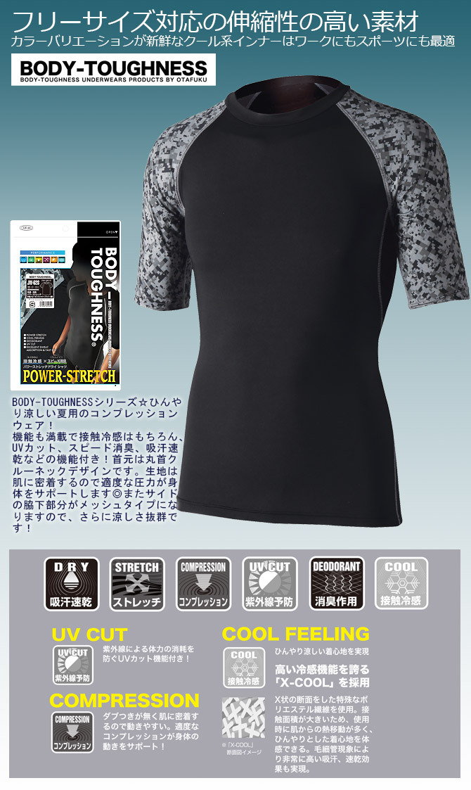 1点までネコポス可 クールコンプレッション パワーストレッチ 半袖 クルーネックシャツ おたふく手袋 JW-628 ボディタフネス