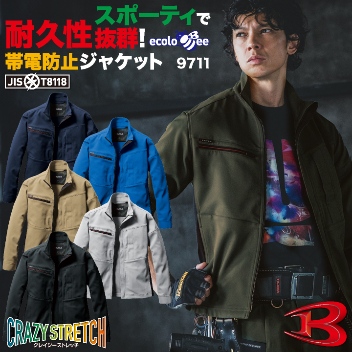 (2025年新作)バートル 長袖ジャケット 秋冬 上着 エコ JIST8118適合 帯電防止 ストレッチ 作業服 工事現場 電気職 運送業 ユニフォーム BURTLE bt-9711
