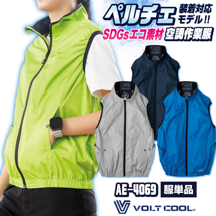 AE-4069 空調作業服 ベスト 服のみ 首元にペルチェ装着可! 裏アルミコーティングでマイナス11℃を実現。 SDGs対応 再生ペットボトル素材 ポリエステル100% ・モニターにより実際の色と多少ちがって見えることがあります。人気商品のため、商品在庫が欠品することがあります。