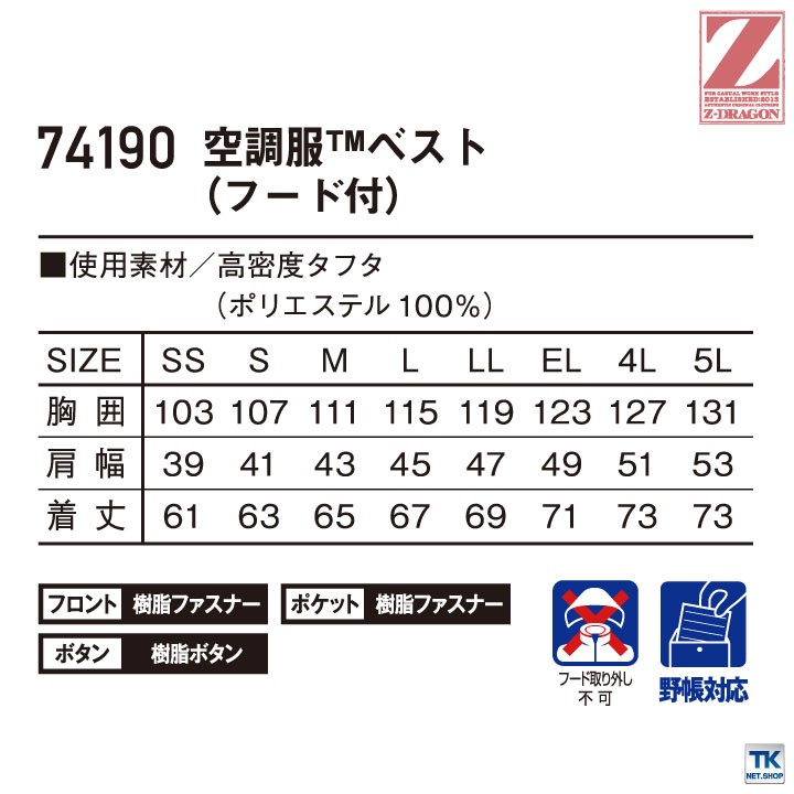 74190 Z-DRAGON ベスト パーカー 迷彩 カモフラ 空調服(R) アウトドア スポーツ カジュアル おしゃれ 作業服 夏 ポリエステル100% メンズ 空調服(R)単品