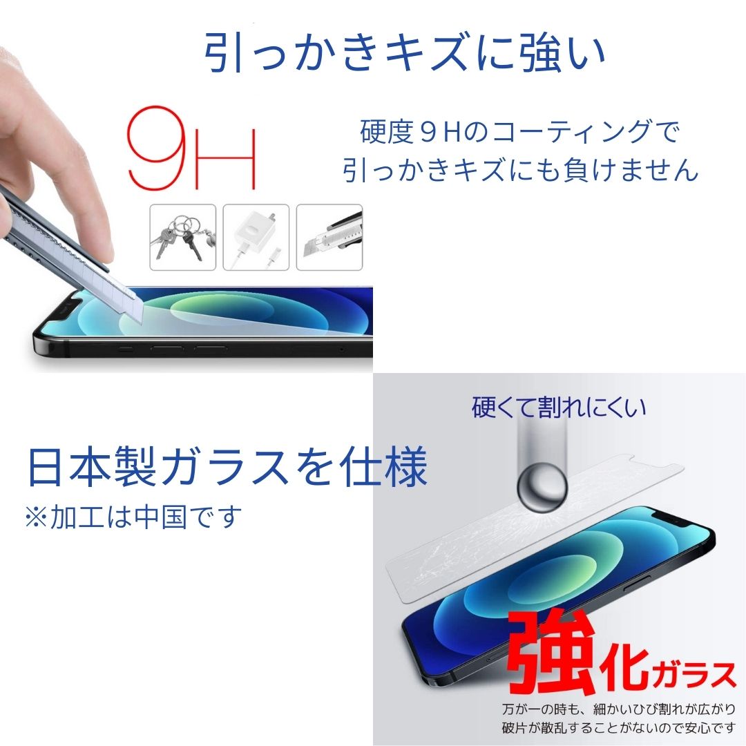 | A. 硬度9Hの強化ガラスを使用、傷や衝撃から画面を保護します。日本製ガラスで耐久性も高く、長くご愛用いただけます。万が一割れても飛散防止加工で安心です。 |