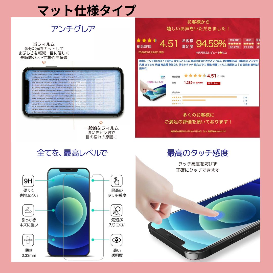 | ◆ スタッフコメント 以下に1200文字以上のEC長文を生成します。 iPhone 17 フィルム:指紋よサヨナラ! サラサラ快適、アンチグレアガラスフィルムでスマホライフを快適に 通勤電車でのイライラ、もう体験したくないですよね? このiPhone 17用ガラスフィルムは、そんなあなたのために開発されました。 アンチグレア加工で光の反射を抑え、指紋がつきにくい特殊コーティングで、いつでもクリアな画面をキープ。 まるで何も貼っていないかのような、サラサラとした快適な操作性を実現しました。 アンチグレアで目に優しい、指紋防止でいつも清潔 太陽の下でも、蛍光灯の下でも、画面が見やすいのがアンチグレアの魅力。 光の反射を抑えることで、目の疲れを軽減し、長時間のスマホ利用も快適になります。 指紋がつきにくい特殊コーティングのおかげで、サッと拭くだけで画面はいつもピカピカ。 清潔感を保てます。 9H硬度でキズから守る、飛散防止で万が一の時も安心 カバンの中で鍵と一緒にスマホを入れても大丈夫。 このフィルムは9Hの硬度を誇り、あなたのiPhoneの画面をキズや衝撃からしっかりと保護します。 万が一、落としてしまっても、飛散防止加工が施されているので、ガラスが飛び散る心配はありません。 全機種対応、簡単貼り付け iPhone 17シリーズはもちろん、iPhone SE(第2世代/第3世代)、iPhone 12、iPhone 14、iPhone 15など、幅広い機種に対応。 全機種対応なので、機種変更の際も安心です。 同梱のチラシには、貼り付け動画のQRコードを掲載。 動画を見ながら、誰でも簡単に、気泡なく美しく貼り付けることができます。 日本製ガラス使用、高品質で安心 このフィルムには。 |