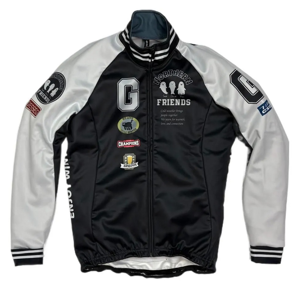 新登場のアザラシ、スナメリ、ペンギンの仲間達をモチーフにしたスタジャン風デザインの防風保温ジャケット。- スナメリは自分の事をオルカと言っていますが・・・他にも雪だるまが熱湯を求めていたり、ネコがしびれていたり、ビールのロゴが二日酔いだったりと、ツッコミどころ満載です。