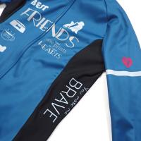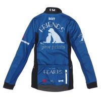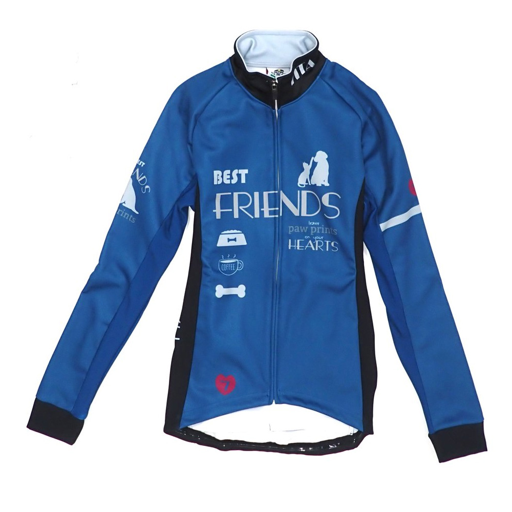 仲良く遊ぶイヌとネコがモチーフとなった、可愛らしいデザインのサイクリングジャケット。- メッセージは「Best Friends leave paw prints on your hearts(親友はあなたの心に肉球跡を残す)」という心温まる言葉がプリントされています。この商品はどんな人でも笑顔にさせること間違いなしです!