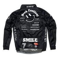 架空のロックフェスをモチーフにしたサイクルジャケット。- フロントはシンプルなワンポイントのスマイルデザイン、バックは架空のロックバンド・ロゴを散りばめたロックフェスT風のデザインとなっています。