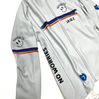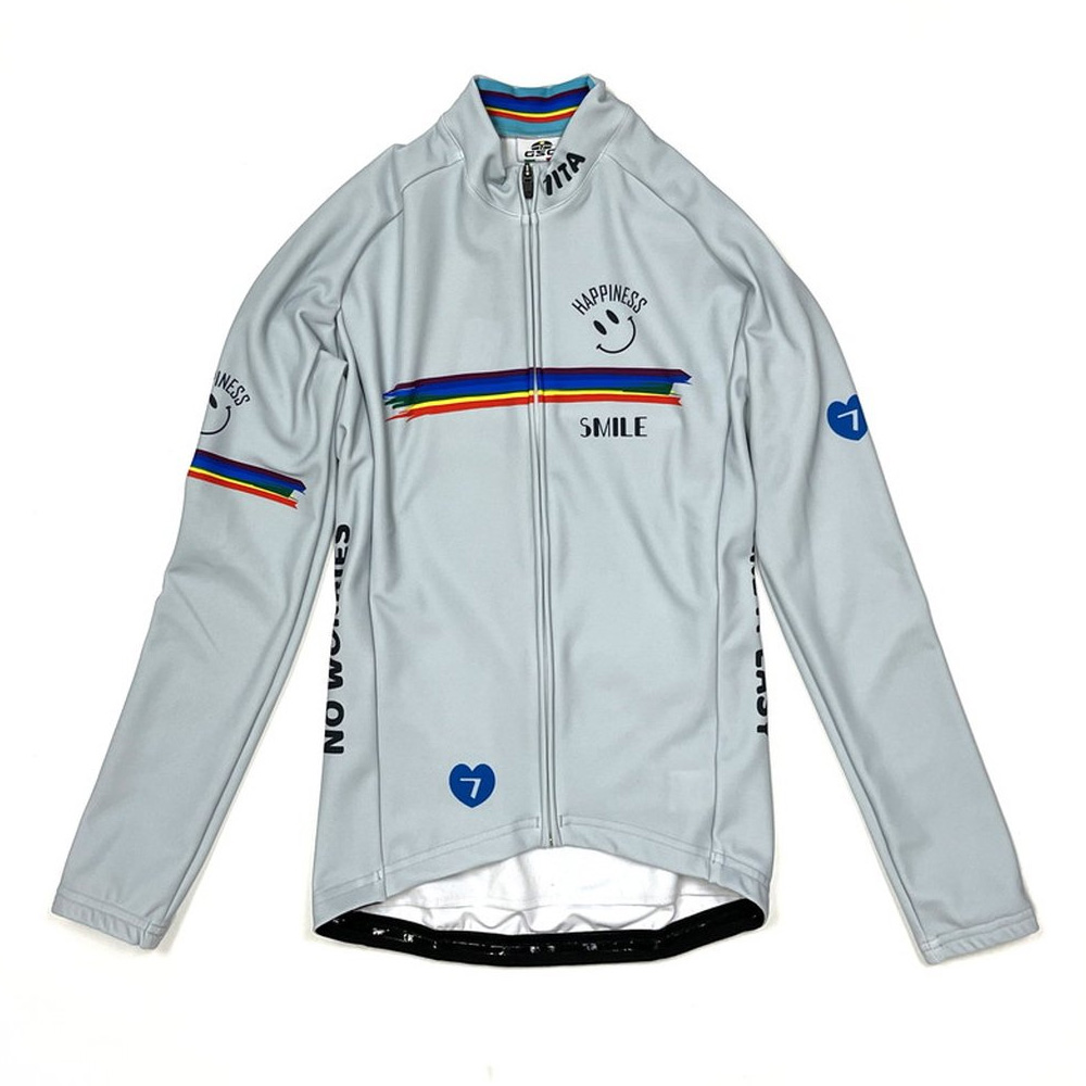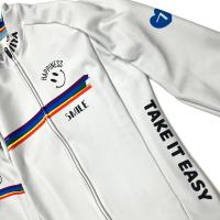 7ITAの魅力が詰まった一着!- スマイル、レインボー、ピースマーク、Happinessのロゴが組み合わさり、カラフルなデザインが目を引きます。さらに、サイドには“No worries, Take it easy”という文字が入り、リラックスした気分でサイクリングを楽しんで頂ける様、願いを込めています。