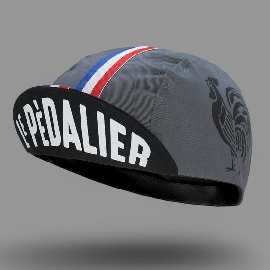 フランスの国鳥である雄鶏(ルースター)のプリントと、トリコロールのリボンが特徴のサイクルキャップ。- フランス語のLe Pedalierは英語でクランクセットの意味。