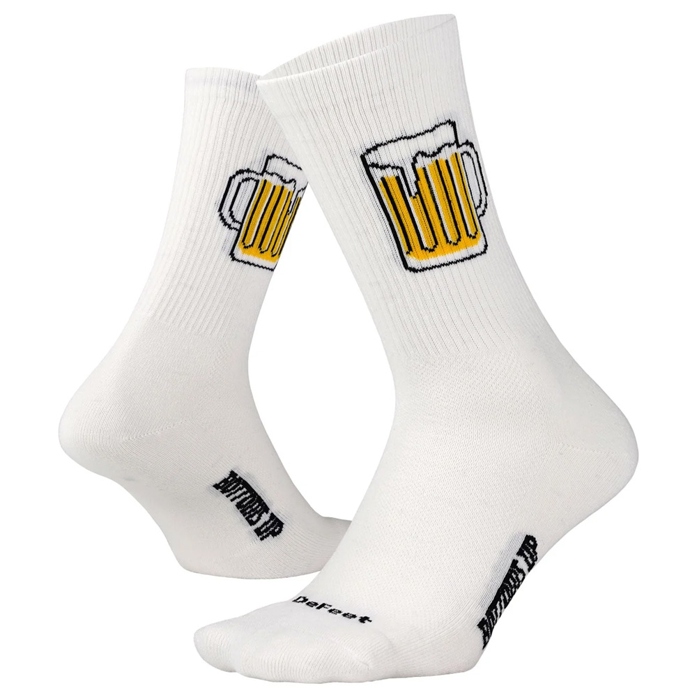Levitator Trail 6インチ ボトムズ アップ クルーソックス (白)- 袖口のサイドに泡立つビールジョッキが描かれており、オクトーバーフェストのお祝いにぴったりです。