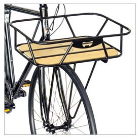 丈夫なスチール製の枠付フロントバスケット、枠の前部には、ボトルオープナー付 - 中空スチール+無垢天然木天板