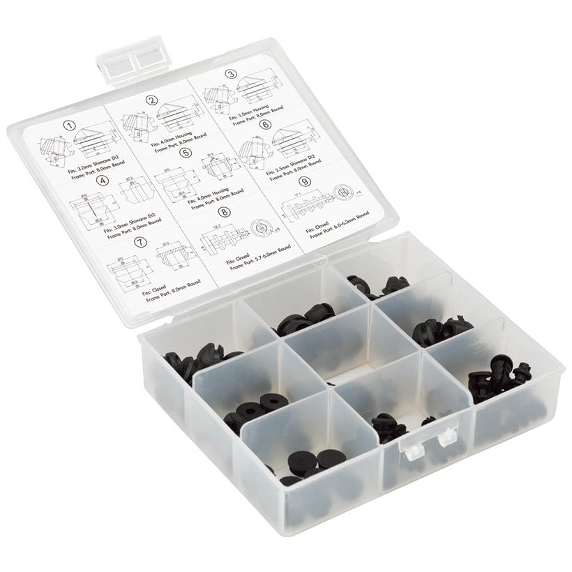 フレームプラグコンボボックスは、内装配線の自転車に最適なソリューションを提供します。- 変速システムの変更や、紛失・破損したプラグの交換など、このコンボボックスには8.0mmと6.0mmの丸型フレームポートに対応する9種類の一般的なフレームプラグが付属しています。