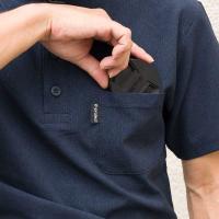 胸ポケットはクレジットカードや交通系ICカードを入れるとちょうど良い大きさ。(iPhone 8/SE3を入れると写真のように少しはみ出してしまいます)
