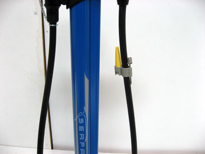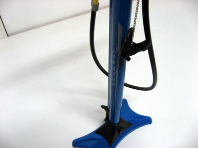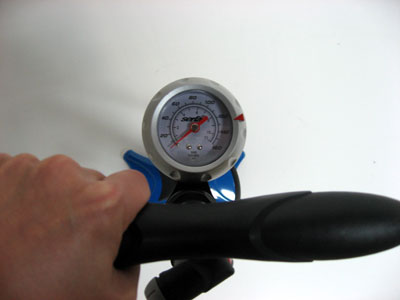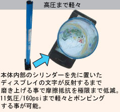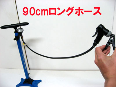| 高い位置に高性能圧力メーターがついているので、 見やすい!11気圧/160psiまで軽々ポンピングが可能 | ホースの長さは90cm。前後タイヤまで楽々バルブヘッド を持って歩くことが可能。=空気を入れる際に、わざわざ ポンプを移動させる必要がない! | ||
