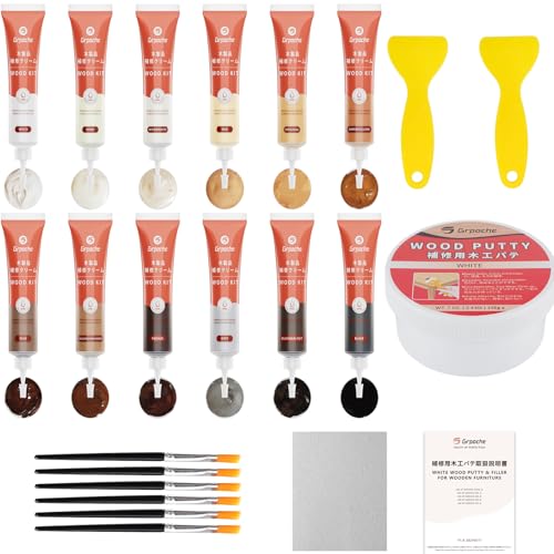 Grpoche フローリング 補修 床 補修 隙間パテ キズ補修 キズ直し ひび割れ 釘目補修 12色木製品補修クリーム 木製の家具 汚れ補修 木工パテ パテ 隙間埋め 床補修キット 木製品キズ補修 フローリング 補修 白 補修DIY ブラシ付き ヘラ*2付き サンドペーパー1付き