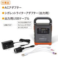 ACアダプター、シガレットライターアダプター(出力用)、出力用USBケーブル(マイクロUSB・ライトニング・タイプCの3種プラグ付き)を同梱。ケーブルを別途購入する必要なく、届いた日からすぐにお使いいただけます。