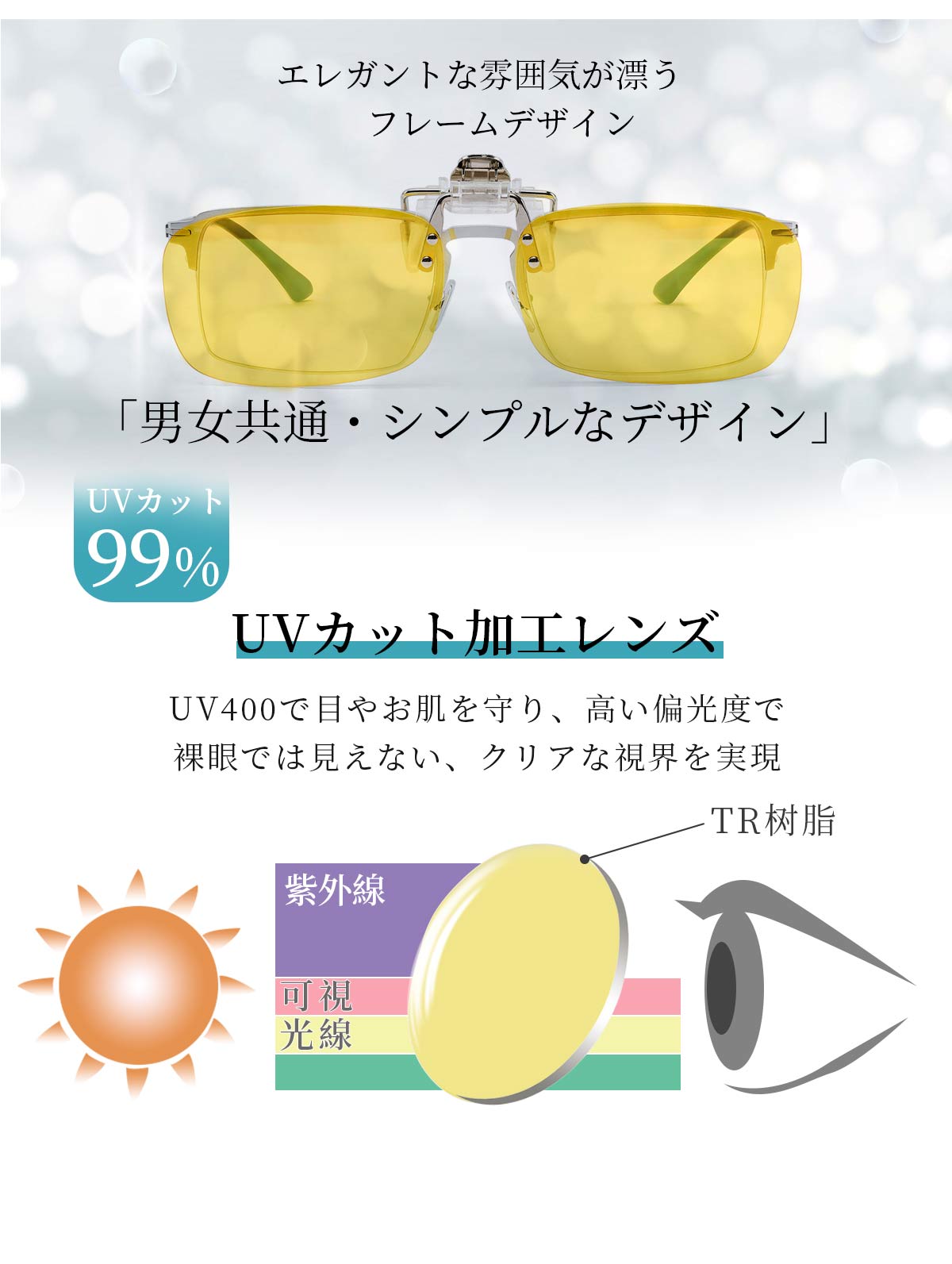 黄色い偏光レンズには強い光線を弱める効果があり、黄色いレンズを通った光は弱くなります。