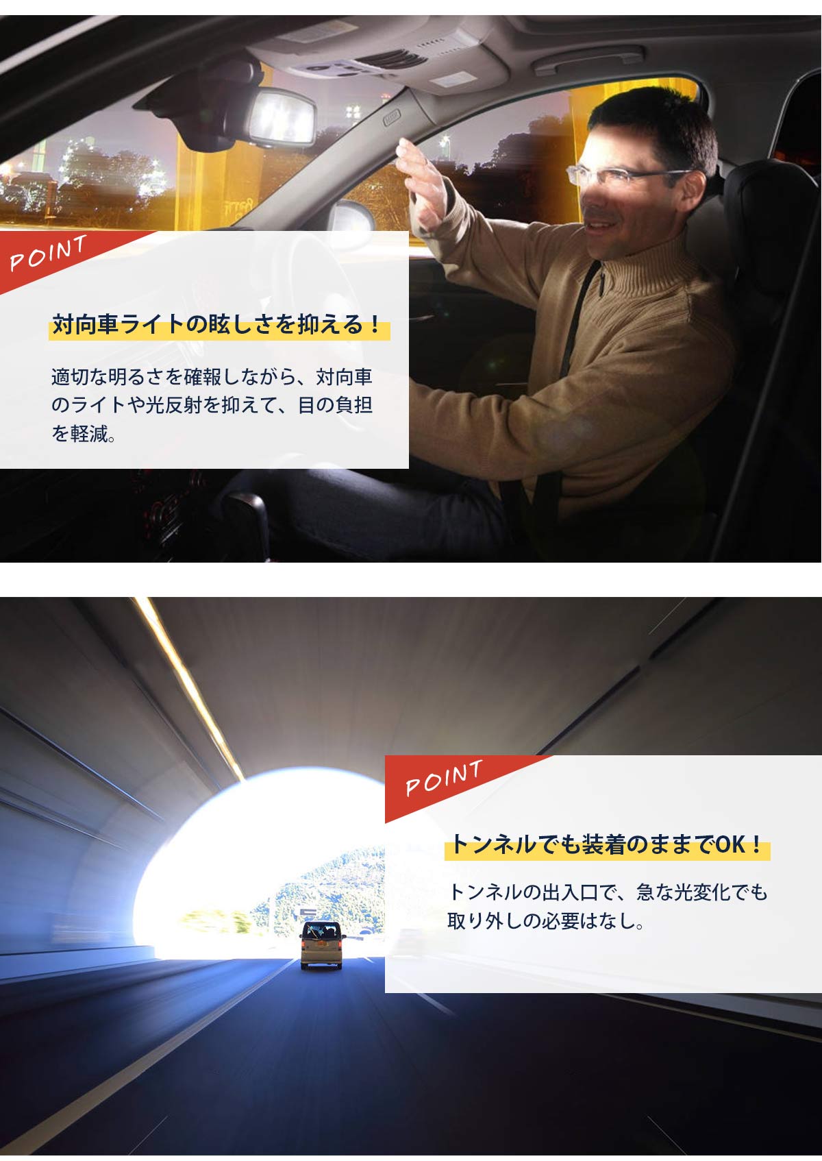 夜間の運転中の対向車のライトなどの強い光を緩和する効果があり、運転の安全性を高めます。