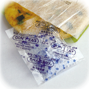 -シリカゲル- 純度の高い(99%以上)二酸化ケイ素からなります。二酸化ケイ素は化学的安定で吸収されないの、間違って食べても中毒を起こす心配はありません。