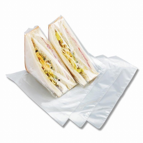 三角型サンドイッチ専用の無地ポリ袋です。サンドイッチの厚みを見越して台形のシルエットになっています。厚0.025×幅90×全体幅220×高200mmIPP