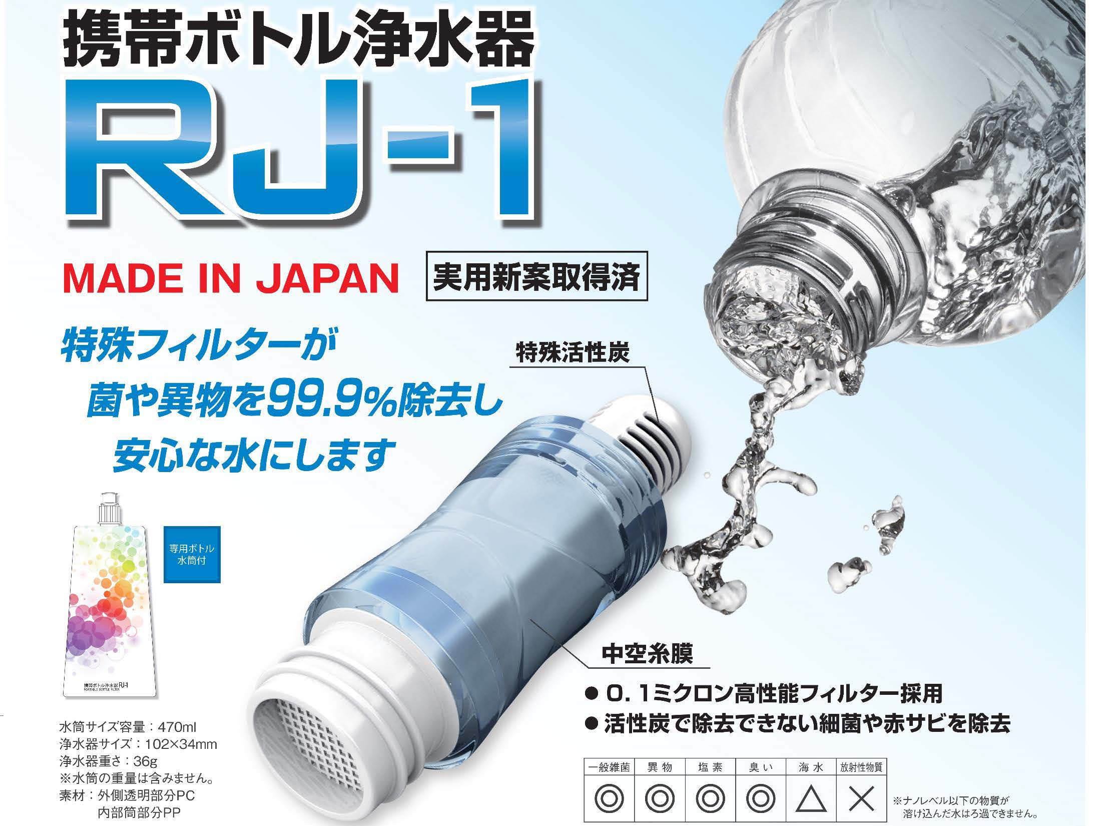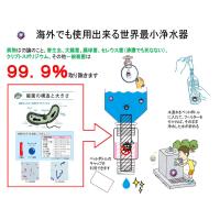 商品の説明 | 自宅や外出先の水道水を持ち運びすることで、経済的にも家計を助けます。 附属の折りたたみ水筒や市販のペットボトル、ポリタンク、その他に接続し、その場に応じた容器サイズに早変わり! 最新の中空糸膜と粒子活性炭を採用し、安全で美味しい水を作り出すことが可能です。 一般菌を99.9%除去することが可能な世界最小の浄水器で場所を取らず、いつでもカバンに入れておくことが可能。 日常生活で使用して頂くことはもちろん、災害や非常時には必要不可欠な製品です。 川や井戸、雨水、風呂水、プール、泥水、トイレ水等であれば完全に濾過し安全な飲み水に早変わりします。 保存していた有効期限の切れたペットボトルの水も可能です。 キャンプ、登山、スポーツ、海外旅行等にも最適な製品です。 【生産国】日本 【使用できる水】 ●水道水、地下水、井戸水 ●魚などの生物が生息している谷川、河川水、湖沼水 ●ポリタンクなどの溜め水、入浴剤などが入っていない風呂水、トイレの タンクの水 ●プールの水、雪解け水、雨水など 【使用できない水】 ●魚などの生物が生息していない谷川、河川水、湖沼水 ●生活排水、工場排水、農薬、除草剤などが流れ込んでいるおそれのある 河川水、湖沼水 ●毒劇物、有機溶剤、有害重金属などが溶け込んでいるおそれのある水 ●その他、海水、ウイルスなどの有害物質を含むおそれのある水 使用上の注意 ・毎回、使用前に浄水した水は流し捨ててください。(出口に付着した菌を放出するためです) ・新品時は活性炭からでる黒い水が出る場合があります。(中空糸膜でろ過するため、体に害はありません。) ペットボトルを装着することも可能です。(企画サイズが違うペットボトルは接続できない可能性がございます。) ・コップ等でお飲みください。(直接飲んで頂いても問題ありませんが、口に付いた菌が繁殖する場合があります。) ・直接飲んだ場合は必ず飲み口を水で洗い流してください。 ・ご使用後は本体内部で菌を繁殖させないために、本体、水筒、活性炭部分を外し、乾燥させると商品の使用容量を伸ばすことが出来ます。(長期に渡り使用しない場合は必ず水気を取り、乾燥させてください。) ・飲料水を始め、非常震災時、目や傷口洗浄、海外旅行、様々な用途で活用できます。 ・菌や異物がフィルター内で限界値に達した時は中空糸膜から水が出なくなります。(商品交換サイン) ・海水や放射性物質はろ過出来ません。 ・軟水から硬水、硬水から軟水には変わりません。 ・ ろ過素材:中空糸膜(0.1ミクロン)+特殊粒子活性炭 ・ ろ過能力:約400L(水質により異なります) 製品タイプ:浄水器+整水器 容器容量:400ml+通常ペットボトル 附属品:400ml折りたたみ容器 |