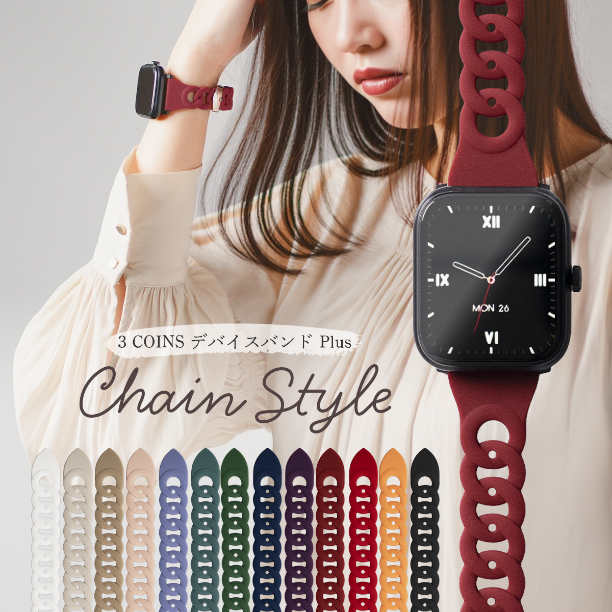 おすすめしたい5つのPOINT 1.シリコンだけどチェーン風デザイン 2.コーデや気分で選べる13色 3.通気性抜群でオールシーズン大活躍 4.日頃のお手入れも簡単 5.簡単装着で、すぐに使える