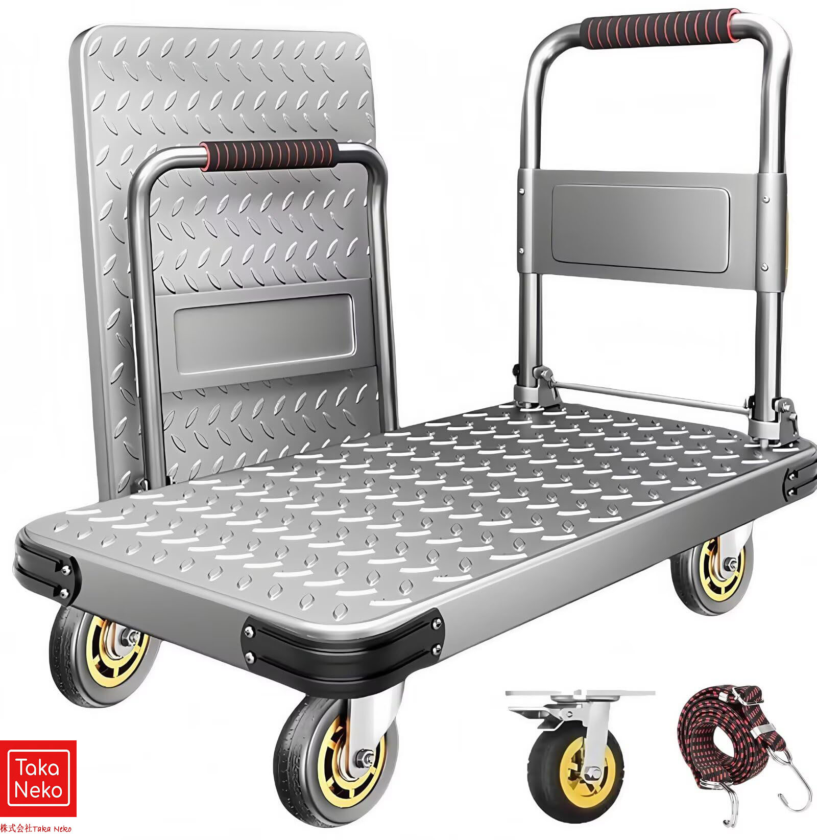 【商品仕様&折りたたみ式台車】 サイズ:幅90CM×奥行60CM、全体の耐荷重能力は1200KGに達することができます。 (注意)製品の取り付けは簡単で、 製品の詳細ページに取り付け画像を掲載しています。