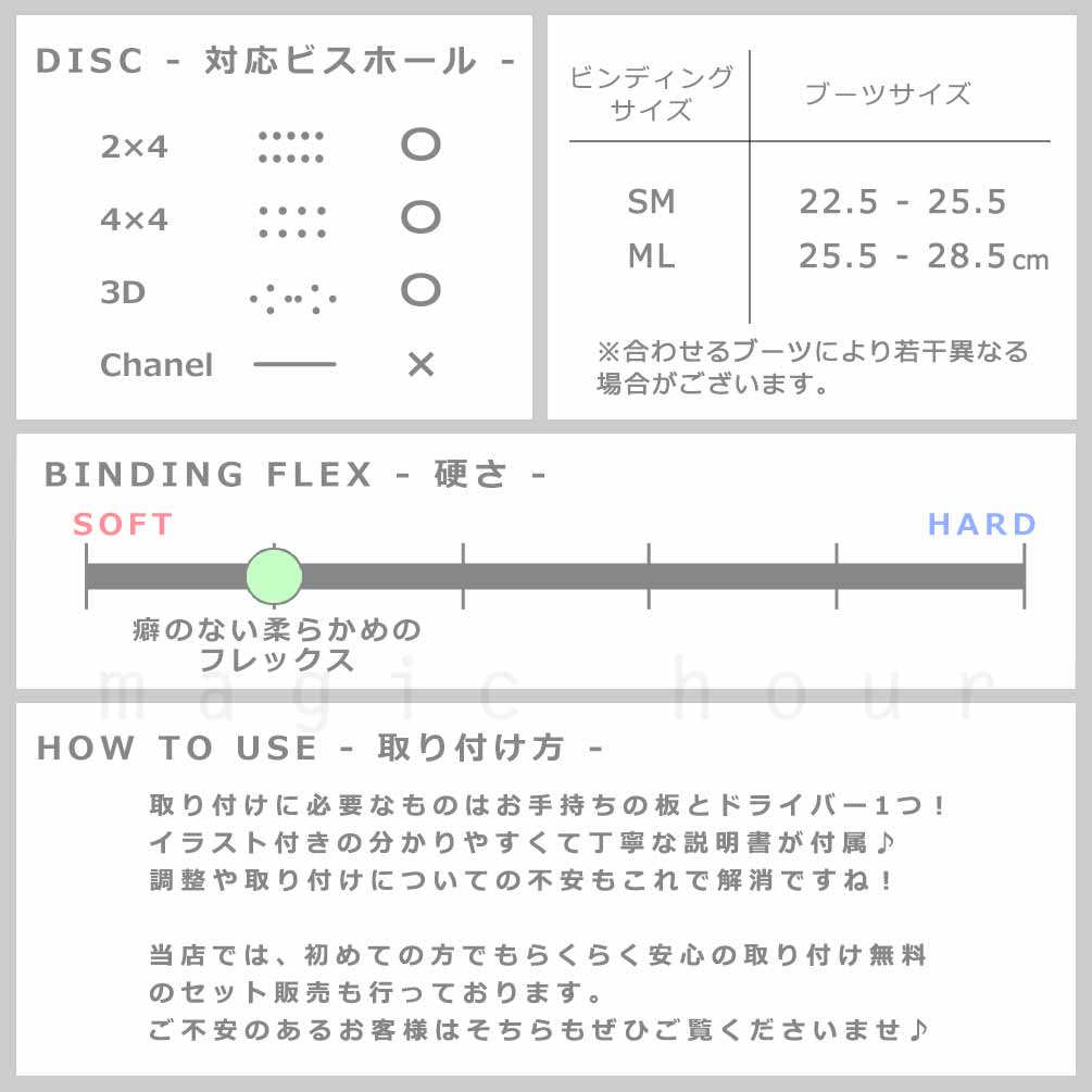 | 主な仕様 | ステップアップをサポートしてくれる扱いやすく設計された軽量&ソフトフレックスの快適ビンディング! くせのない柔らかめのソフトミドルフレックスで初心者さんやジュニアライダーも安心の仕様♪ 軽量化された3Dアンクルストラップでズレにくく優しくブーツを固定、ストレスを感じにくい! 扱いやすく設計されたラチェットで操作しやすい♪日本語の説明書付きで初めての方も安心です! |