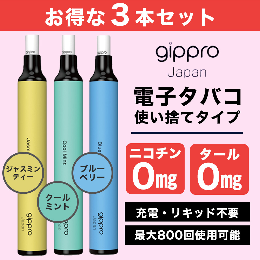 gippro 電子タバコ 使い捨て 3本セット 吸い比べ ブルーベリー&ジャスミンティー&メンソール MAX800回吸引可能 ノンニコチン ノンタール