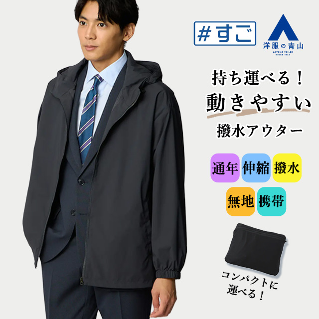 【洋服の青山】持ち運べる コンパクト アウター メンズ 秋冬春夏 グレー 灰色 無地 ストレッチ フード 裾ドローコード フロントジップ 動きやすい