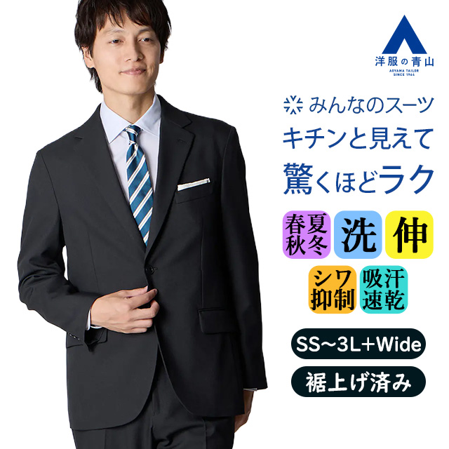 【洋服の青山】みんなのスーツ 裾上げ済み スーツ メンズ スリム 春夏秋冬 ブラック 黒無地 2ボタン ノータック 洗える 動きやすい シワになりにくい ビジネス