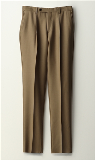トレンド感漂うワンタックテーパードパンツ。外気の暑さを遮断し、吸湿・放湿に優れたウール100%の天然素材を後染めした、深いベージュのニュアンスカラーが特徴的です。ゆったりとした腰回りのアウトワンタック仕様ながら、裾にかけたテーパードでスマートなシルエットになっています。同素材のシングルジャケットとのセットアップも可能。オンオフともに活躍する汎用性の高さも魅力です。