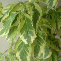 落葉樹。5月の誕生木です。斑入り葉の白花のハナミズキです。通常のハナミズキにはない白色の斑入り葉で花のない季節でも葉だけで観賞できる品種です。