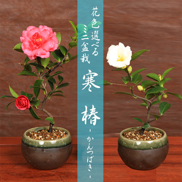 ミニ盆栽 花色選べる :寒椿(黒色緑縁瀬戸焼小鉢)*<2026年初春開花予定>かんつばき ツバキ bonsai
