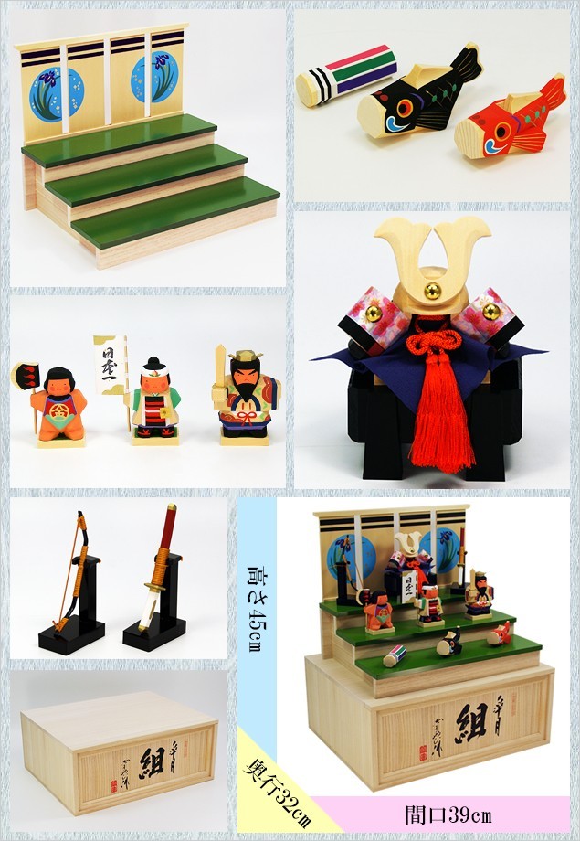 | 間口39×奥行32×高さ45cm (兜:13cm 人形:7.5〜9.5cm 鯉のぼり:9.5cm) |