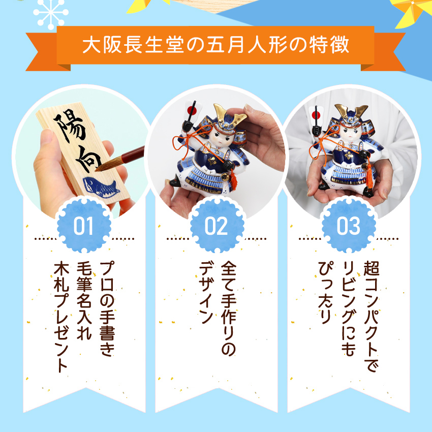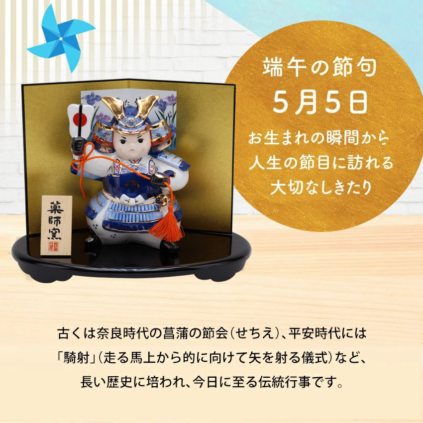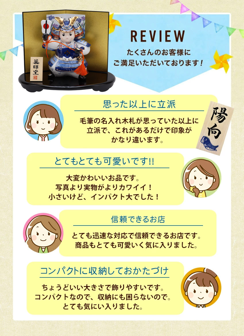 | 大切なお子様のご誕生の慶びを祝い、兜飾りや鯉のぼりに触れ飾る楽しさも日本の伝統文化に親しむ節句ならではの喜びです。 どんなに時代は変化してもお子様の健やかな成長を祈る気持ちはいまも昔も変わりません。 当店で扱う五月人形は最近の住宅事情を踏まえ、机の上に簡単に、コンパクトに飾れるような可愛い五月人形や鯉のぼりばかりです。 和室にも洋室にも場所を選ばず、五月人形を飾るだけでなごみの空間を作り出してくれます。 一つ一つ丁寧に手作りされた五月人形。新緑の中、お子様の健康とすこやかな成長に想いを馳せ、初節句をお祝いください。 | |