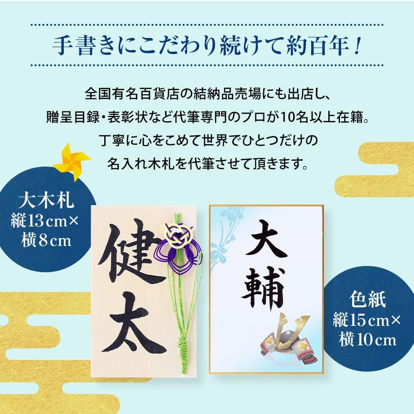 | 当店は昭和6年創業の老舗結納品店です。いわゆる「のし」の専門店です。複数の筆耕専属者が在職しておりますので、当店では五月人形(鯉のぼり、兜飾り)にサービスでお付けいている名入れ木札はすべて手書きで行っております。 機械での彫刻名入れと違い、難しい漢字でもお書きすることが可能です。 |