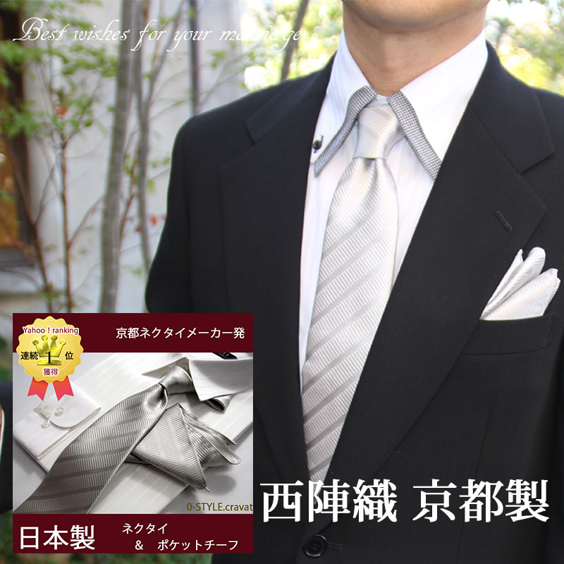 【シルク 日本製 ネクタイ&ポケットチーフ セット シルバー】