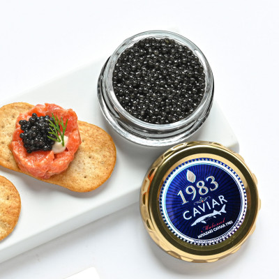 宮崎県産のチョウザメの卵を岩塩のみで薄く味付けし、60日以上かけて熟成させた「宮崎キャビア1983」は、熟成によって生まれる濃厚な旨味と、粒の美しい艶と輝きが特徴です。