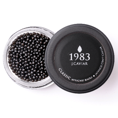 宮崎県産のチョウザメの卵を岩塩のみで薄く味付けし、60日以上かけて熟成させた「宮崎キャビア1983」は、熟成によって生まれる濃厚な旨味と、粒の美しい艶と輝きが特徴です。