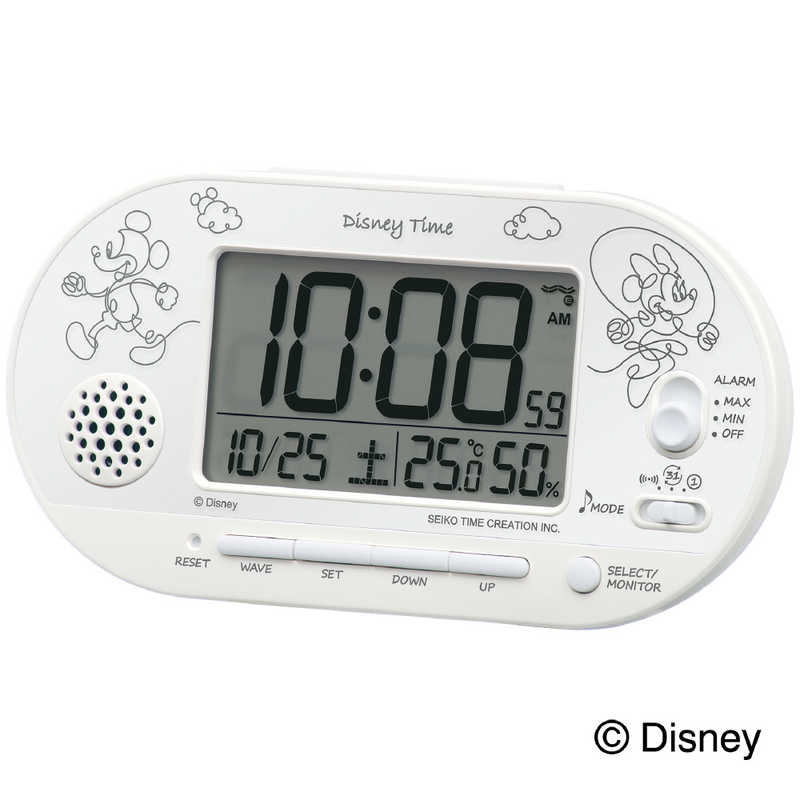 【商品解説】●一筆書きで表現されたミッキーとミニーのアートがさりげなく配置された、大人可愛いデジタルクロック。