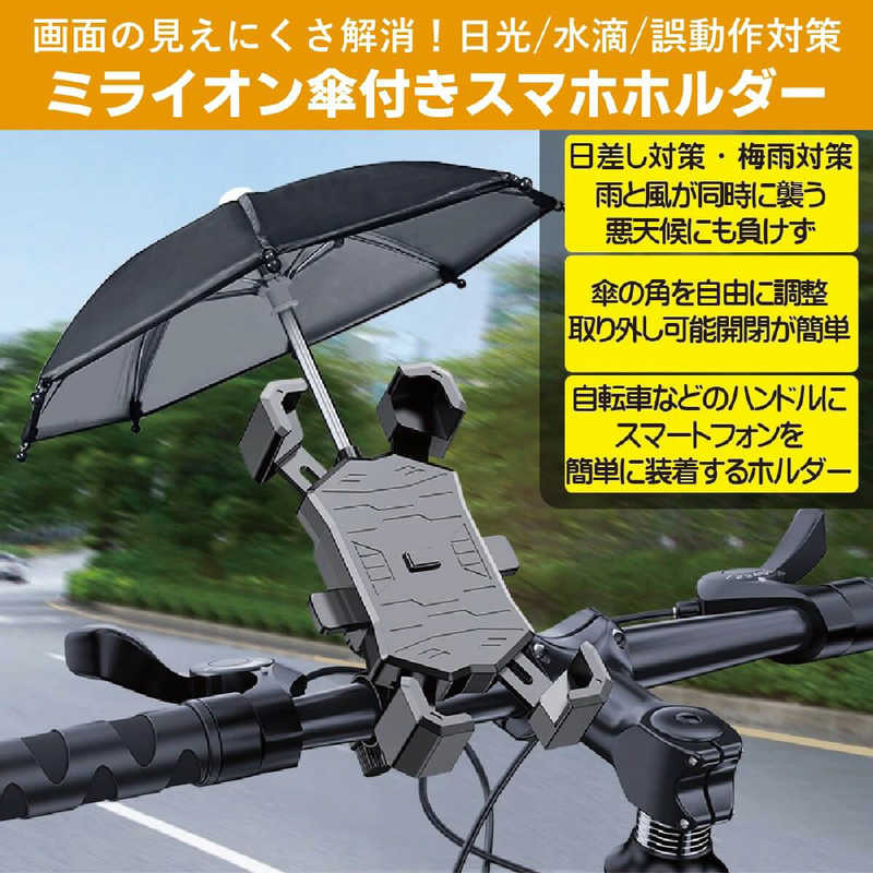 【商品解説】スマホ画面の反射や熱、日焼け、雨による誤操作等からスマートフォンを守る!自転車用「ミライオン傘付きスマホホルダー」